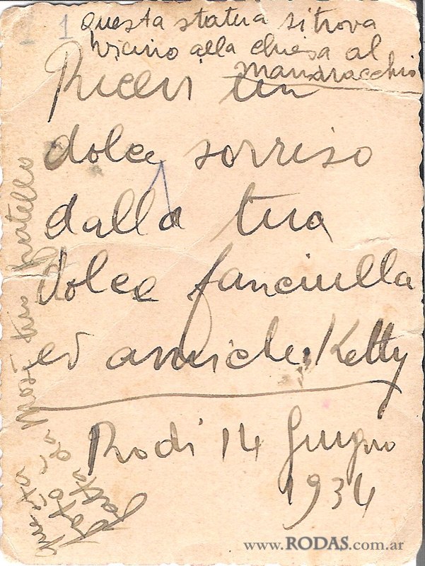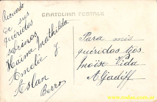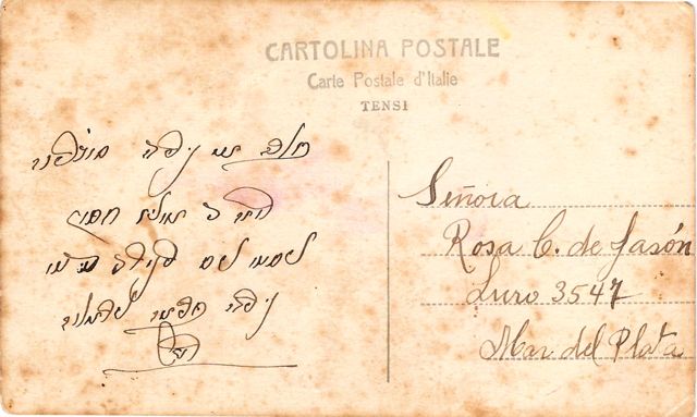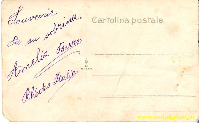 Foto enviada desde Rodas a Rosa Coehn de Hana en Mar del Plata (Argentina). Anverso y reverso (Nora Cohen: "postal traída por mi abuela de Rodas para ser entregada a mi tía Rosa Cohen de Jasson)