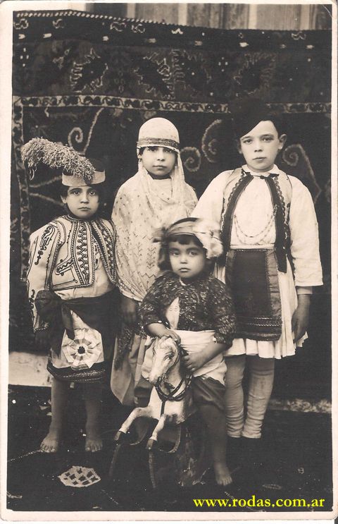 Foto de Purim. En la foto están los cuatro hermanos Berro: Jaime (Haime); Matilde (Mathilda), Amelia (Amelie) y Aslan. La postal era enviada a sus tíos Moise y Vida Aljadeff (Alhadeff). (Mary Berro). |