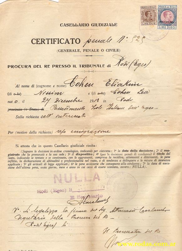 Certificado Penal de Eliakim Cohen (Nora Cohen) |