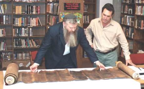 Biblioteca "Levy Family" del the Sephardic Temple Tifereth Israel donde el Rabino David Rue está analizando las letras hebreas del Sefer Torah mientras Aron Hasson, fundador de The Thodes Jewish Historical Foundation observa. Foto The Thodes Jewish Historical Foundation.